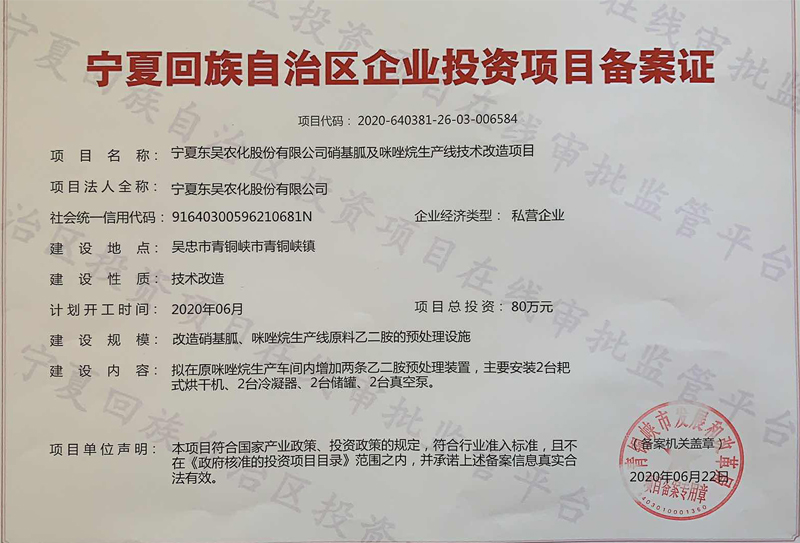 寧夏回族自治區(qū)企業(yè)投資項目備案證